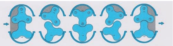 兩個葉輪相向轉動,由于葉輪與葉輪、葉輪與機殼、葉輪與墻板之間的間隙極小,從而使進氣口形成了真空狀態,空氣在大氣壓的作用下進入進氣腔,然后,每個葉輪的其中兩個葉片與墻板、機殼構成了一個密封腔,進氣腔的空氣在葉輪轉動的過程中,被兩個葉片所形成密封腔不斷地帶到排氣腔,又因為排氣腔內的葉輪是相互嚙合的,從而把兩個葉片之間的空氣擠壓出來,這樣連續不停的運轉,空氣就源源不斷地從進氣口輸送到出氣口,這就是羅茨風機的整個工作過程。